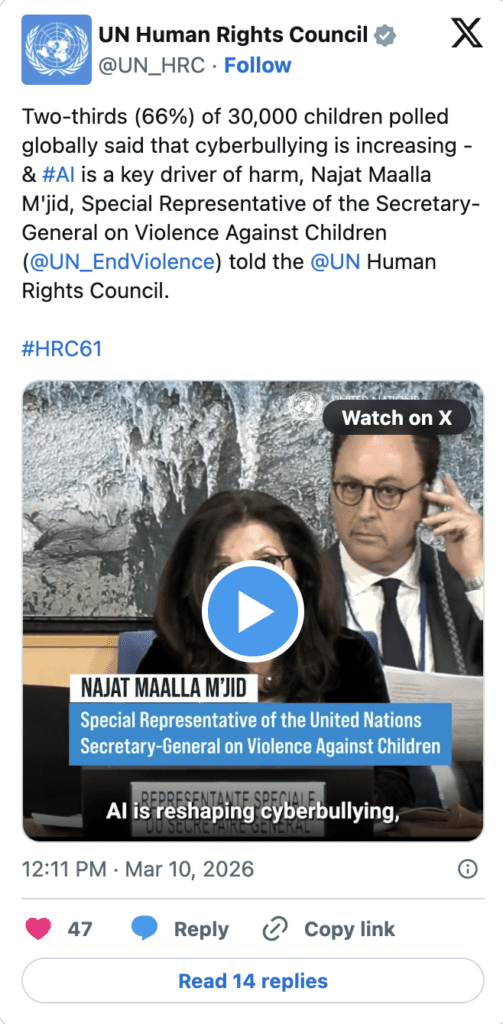 Around two-thirds of children worldwide report an increase in cyberbullying, with one in two say they don’t know how to get the right support, according to a recent poll carried out by the UN’s top official who works to end violence against children.