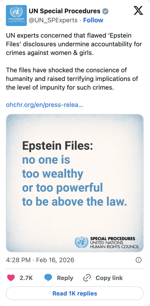 They further underscored that “resignations of implicated individuals alone are not an adequate substitute for criminal accountability,” welcoming steps by some governments to probe current and former officials and private individuals named in the files. They called on other States to do the same.