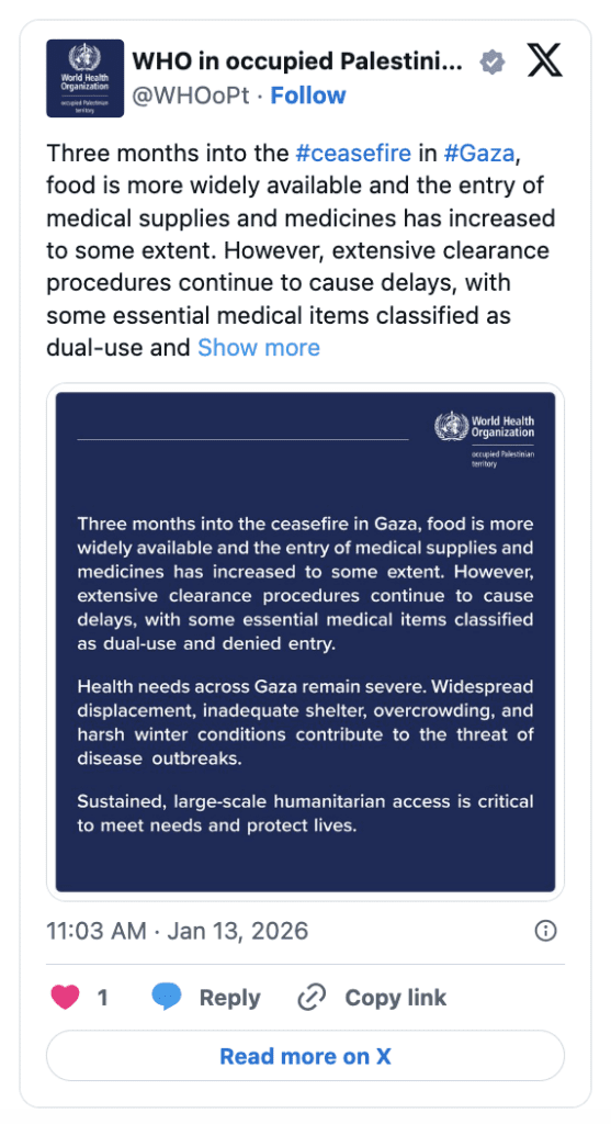 “Some essential medical items are classified as ‘dual-use’ and denied entry,” WHO said in a post on X, in reference to goods that are primarily intended for civilian use but which the Israeli authorities believe could be diverted by Hamas or other militant groups for military purposes.