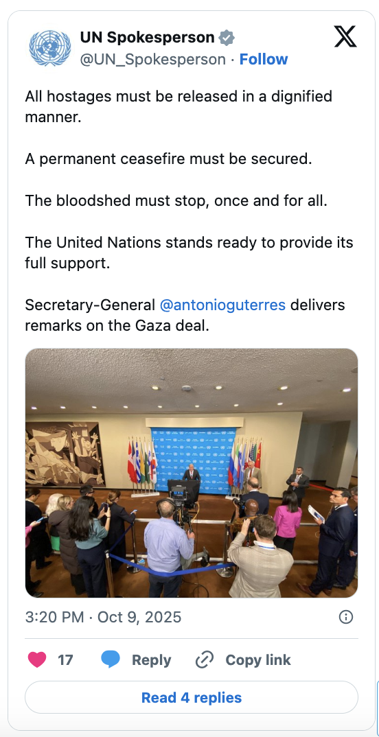UN Secretary-General António Guterres has urged Israel and Hamas to “fully abide” by the ceasefire and hostage release deal, calling it a “desperately needed breakthrough” that must mark “the beginning of the end of this devastating war.”