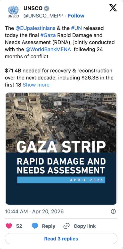 That’s according to the final Gaza Rapid Damage and Needs Assessment (RDNA), jointly conducted with the UN-partnered World Bank.