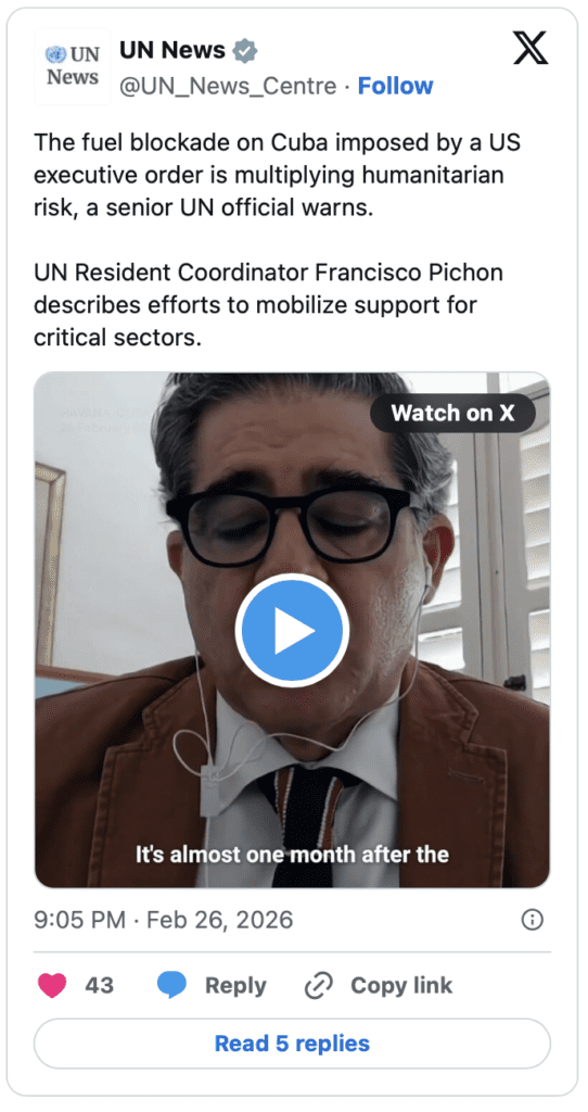 Cuba’s humanitarian situation is worsening as fuel shortages deepen nearly a month after Washington took measures to block oil supplies from entering the Caribbean nation, a senior UN official warned on Wednesday.