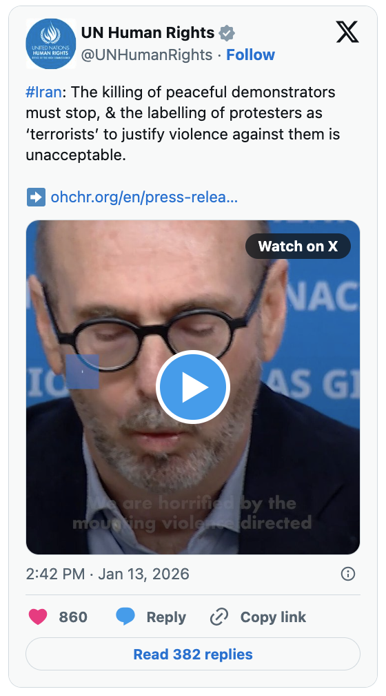 He noted that since 8 January, the Iranian authorities have imposed a nationwide internet shutdown, affecting peoples’ rights to freedom of expression and access to information, disrupting emergency and lifesaving services and obstructing independent human rights monitoring.