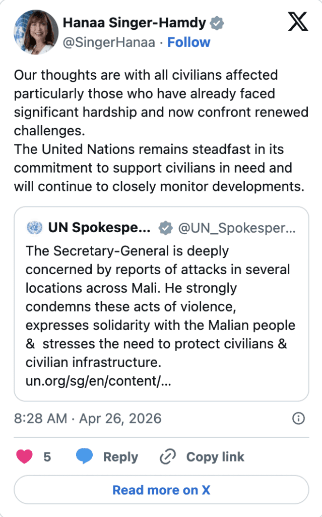 The UN’s top official in Mali who coordinates the organization’s work inside the country, Hanaa Hamdy-Singer, said in a social media post on Sunday: “Our thoughts are with all civilians affected particularly those who have already faced significant hardship and now confront renewed challenges.”