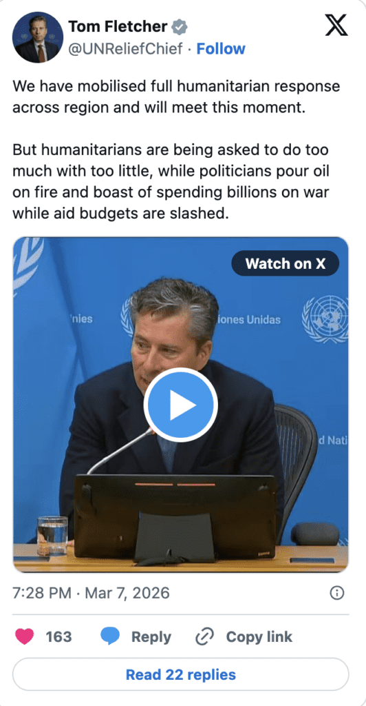 Echoing the deep concerns across the international community at the impact of the ongoing war on civilians, the UN’s top aid official, Tom Fletcher, warned of wider, secondary impacts in countries including Afghanistan and Pakistan “where needs were already great”.