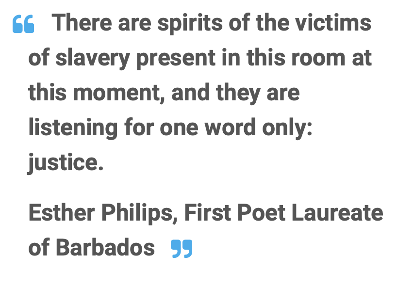 There are spirits of the victims of slavery present in this room at this moment, and they are listening for one word only: justice,” Ms. Philips told delegates.
