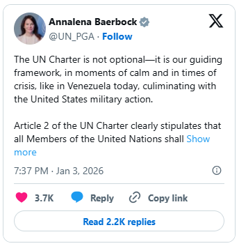 “The Secretary-General is deeply alarmed by the recent escalation in Venezuela, culminating with today’s United States military action in the country, which has potential worrying implications for the region,” said a statement issued by UN Spokesperson Stéphane Dujarric.